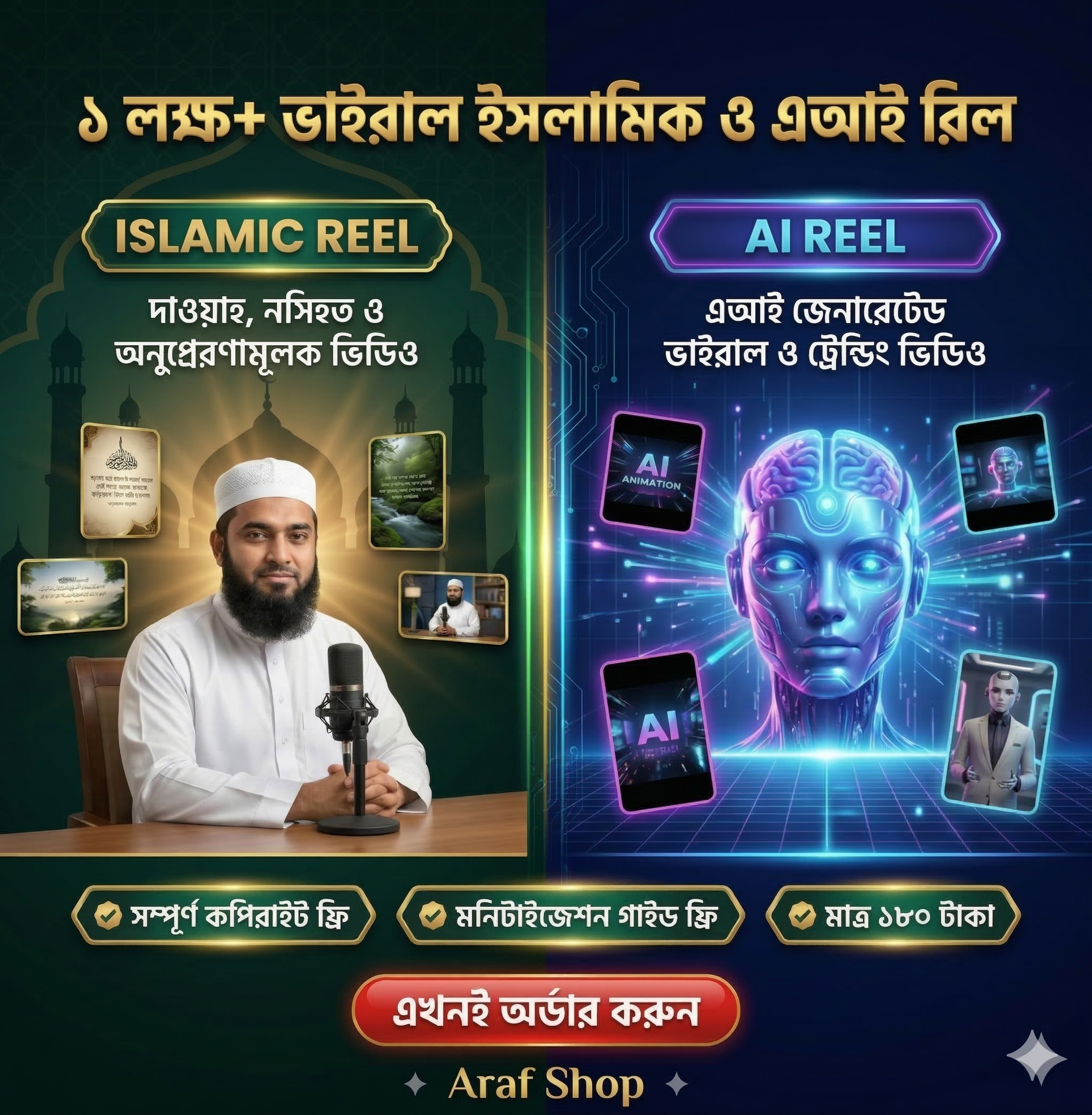 Araf Shop নিয়ে এসেছে ১ লক্ষ+ ভাইরাল ইসলামিক ও এআই রিল এর বিশাল প্রিমিয়াম বান্ডেল — যা আপনার কনটেন্ট সমস্যার সম্পূর্ণ সমাধান।